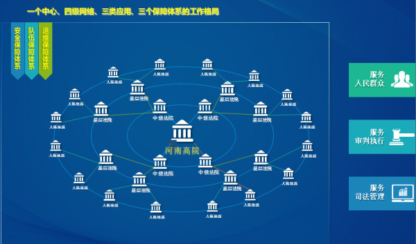 先后建成的信息集控中心、核心機房、執(zhí)行指揮中心、視頻綜合管理監(jiān)控系統(tǒng),視頻會議系統(tǒng)、高清數字法庭系統(tǒng)、辦案區(qū)安防系統(tǒng)、涉訴信訪接待系統(tǒng)、12368平臺、OA辦公系統(tǒng)、移動辦公辦案系統(tǒng)、數據分析平臺等,使案件從立案到結案流程數據全程可視;法律文書從制作、糾錯、屏蔽、上網一鍵完成;庭審活動實現了全程的錄音錄像。實現了“審判管理網絡化,電子審核簽發(fā)化,庭審活動科技化,機關辦公無紙化”,通過信息化建設增進了資源共享、提高審判效率、節(jié)約審判資源、方便群眾訴訟的目的,形成了網絡全互聯,業(yè)務廣覆蓋、數據大集中、資源共享用的河南法院信息化工作格局。 ?