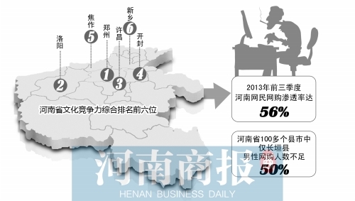 而據(jù)中原文化研究所助理研究員郭海蓉介紹,2013年前三季度,河南網(wǎng)民網(wǎng)購滲透率達56%,高于全國平均水平10.1個百分點。