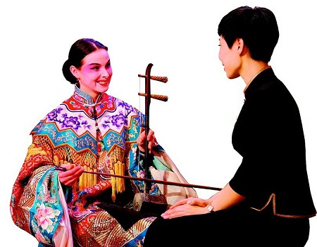 在演員、服裝師和琴師指導下,獨立電視臺著名主持人歐莉婭體驗了戲曲演員扮戲的過程:化好旦角的妝,再穿上《貴妃醉酒》里的戲服;水袖一甩,折扇掩面,舉手投足間頗有幾分味道;一轉頭,又有模有樣地拉起京二胡。只是,演出快要開鑼了,這位“洋貴妃”仍穿著一身行頭主持節(jié)目,急壞了青衣潘欣。