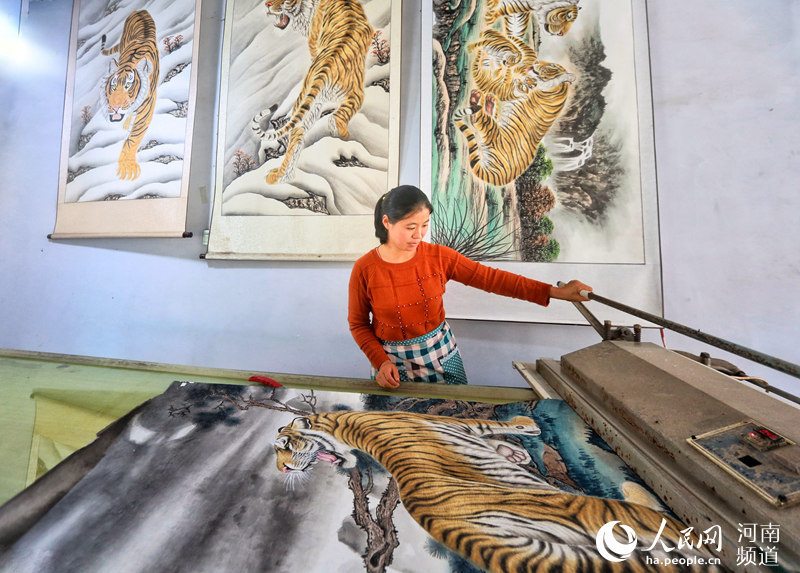 近日,記者走進(jìn)民權(quán),用鏡頭見證“畫虎村”的新氣象。全村1000多人中,有400多人從事以畫虎為主的繪畫產(chǎn)業(yè)。他們的作品不僅行銷國(guó)內(nèi)書畫市場(chǎng),還遠(yuǎn)銷美國(guó)、日本、韓國(guó)、新加坡等國(guó)家。2016年,王公莊村年繪畫產(chǎn)業(yè)創(chuàng)產(chǎn)值6000多萬(wàn)元,輻射帶動(dòng)周邊1500多人從事繪畫相關(guān)工作,昔日的農(nóng)業(yè)村舊貌換新顏,變成了名副其實(shí)的“農(nóng)民畫虎第一村”。
