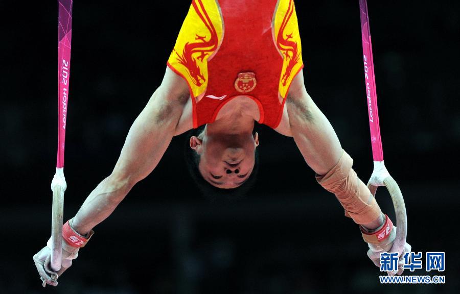 7月30日,中國(guó)選手陳一冰在吊環(huán)比賽中。當(dāng)日,在倫敦奧運(yùn)會(huì)體操男子團(tuán)體決賽中,中國(guó)隊(duì)獲得冠軍。 新華社記者王建華攝
