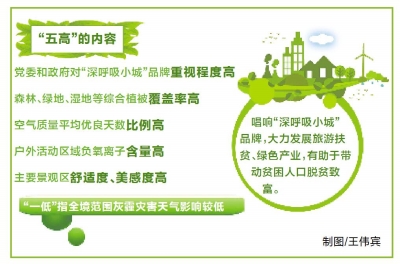 中國氣候變化專家委員會主任劉燕華在接受采訪時指出,隨著人們健康觀念的提升和旅游業(yè)的發(fā)展,“深呼吸小城”品牌有助于發(fā)揮綠色品牌效應,助推“綠水青山”轉化為“金山銀山”。他說,比如河南入選“全國百佳深呼吸小城”名單的7個縣市,除林州市外,其他6個縣都是國家級貧困縣。這些縣唱響“深呼吸小城”品牌,大力發(fā)展旅游扶貧、綠色產業(yè),有助于帶動貧困人口脫貧致富。