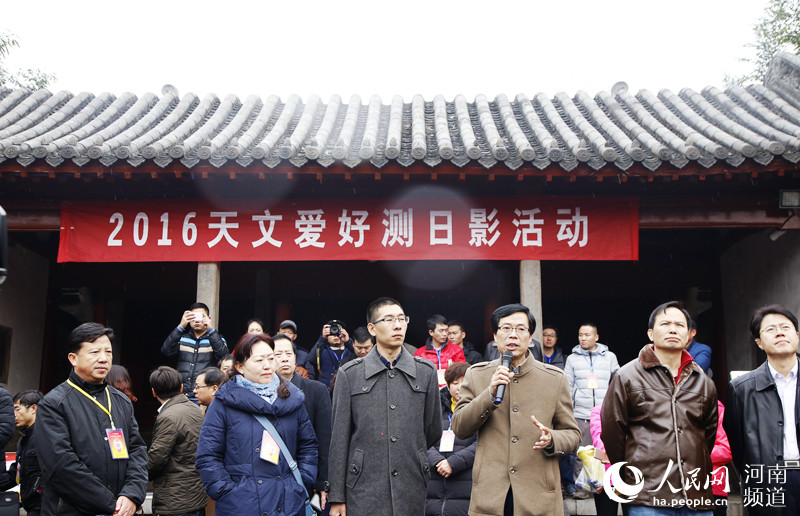 將近午時,十余名天文愛好者采用元代觀天之法,順利利用周公測景臺和元代觀星臺現(xiàn)場測日影定準(zhǔn)冬至節(jié)令。經(jīng)測定,觀星臺文管所所長安麗宣布,冬至日觀星臺橫梁太陽高度角32度9分44秒,影長15.6332米,告成正午時間是北京時間12點(diǎn)25分28秒。
