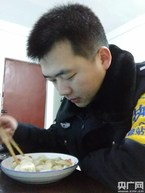 忙碌了一天民警李遠亮吃碗餃子過年了