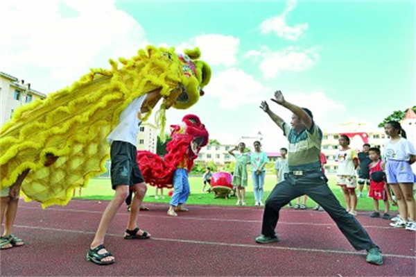 江西宜春市宜豐縣花橋鄉(xiāng)中心小學的學生在老師的帶領下學習舞獅的動作要領。周亮攝/光明圖片
