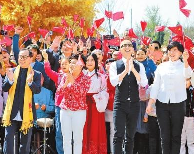 “我和我的祖國,一刻也不能分割……”當一個小女孩用豫劇唱腔唱響這熟悉的旋律,瞬間點燃了現(xiàn)場的熱情,四面八方的群眾隨著歌聲聚集在一起。他們一邊引吭高歌,一邊揮動著手中的小紅旗。他們之中有耄耋老人,也有幾歲的幼童。大家把心中對人文始祖軒轅黃帝的崇敬之情,對祖國的熱愛之情,都化作一首首歌,響徹整個黃帝故里。