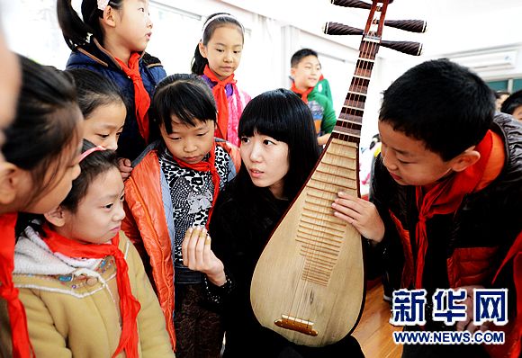 11月13日,河南省青年民族樂團(tuán)琵琶演奏員劉曉萌(右二)給小學(xué)生講解演奏知識。
