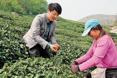 圖③周正祥在茶園指導(dǎo)工人采茶。