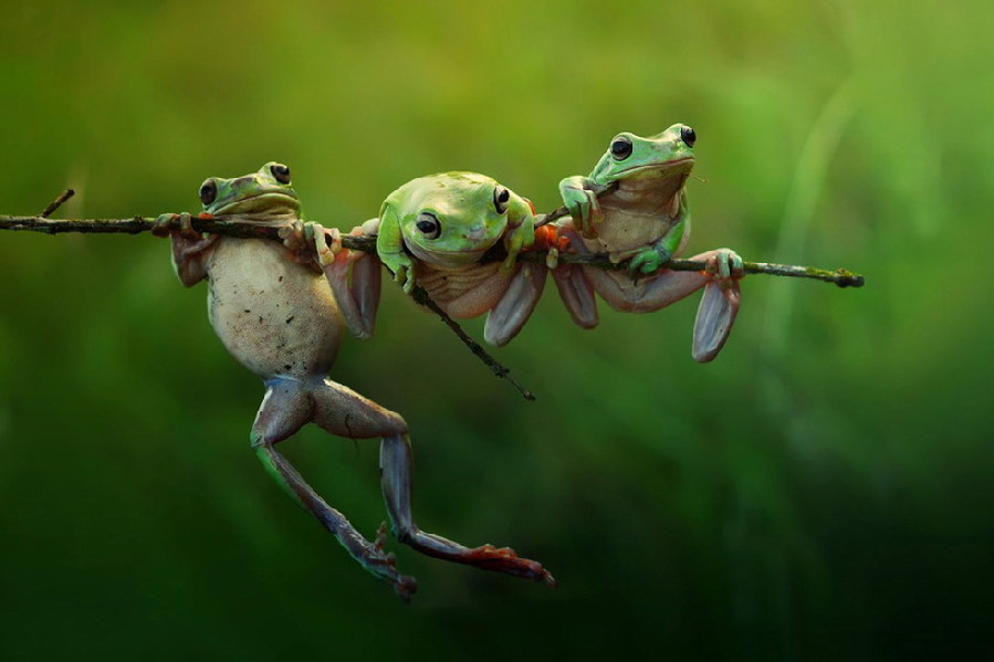 三只青蛙吊在一根纖細(xì)的樹枝上維持平衡。(網(wǎng)頁截圖)