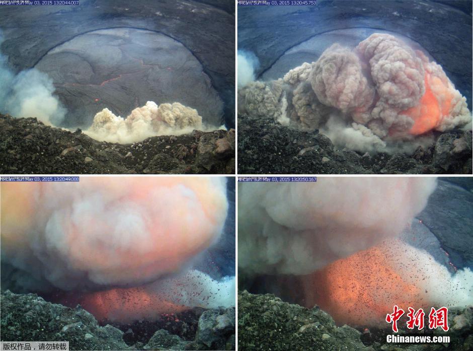 2015年5月5日,美國(guó)地質(zhì)調(diào)查局發(fā)布照片顯示,夏威夷基拉韋厄火山的哈里摩摩火山口5月3日崩塌,激起火山灰和熔巖爆炸,狀如烈焰。熔巖湖中的巖漿多次溢出,場(chǎng)面壯觀。