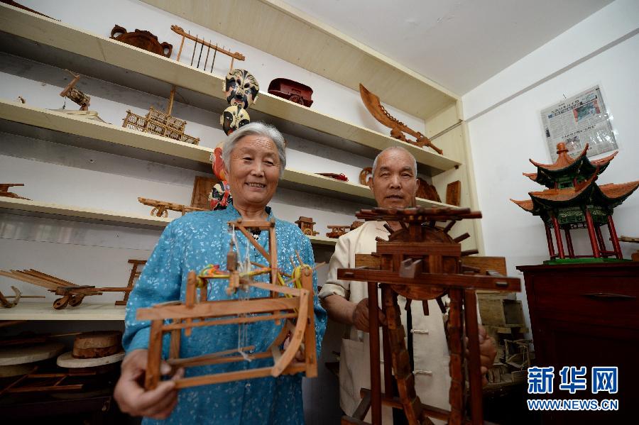 5月6日,李樹森(右)和老伴王月琴手捧自己手工制作的木制微縮老式農(nóng)具。