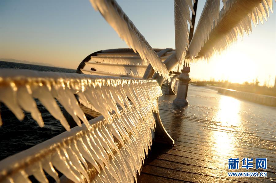 12月27日,大連東港沿海護(hù)欄冰凌凝結(jié),在朝霞的映照下十分美麗。新華社發(fā)(呂文正 攝)