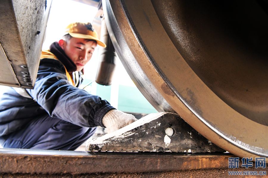 1月24日,一名調(diào)車員將止輪器放在車輪下,進(jìn)行防溜作業(yè)。 春節(jié)臨近,鐵路迎來節(jié)前客流高峰。鐵路運(yùn)輸工作中,離不開一群為火車“穿針引線”的人——調(diào)車員,他們24小時(shí)不間斷輪班,保證列車按時(shí)出入庫,并根據(jù)車次、客流的變化,對(duì)列車車廂進(jìn)行拆分和重新編組,保障春運(yùn)期間列車安全、準(zhǔn)時(shí)運(yùn)送旅客。 鄭州火車站運(yùn)轉(zhuǎn)車間調(diào)車長程浩說:“我們的工作是把一節(jié)節(jié)車廂編組成一列火車,將其中有問題的車廂換掉,送檢、清洗,再將整列火車?yán)交疖囌景l(fā)車,形象點(diǎn)說就是為火車穿針引線!痹卩嵵莼疖囌具\(yùn)轉(zhuǎn)車間,調(diào)車小組一般由5人組成:一名調(diào)車長,四名組員。組長負(fù)責(zé)指揮調(diào)車任務(wù),組員負(fù)責(zé)檢查和監(jiān)督列車車廂之間的分解與連掛,為車輛進(jìn)行排風(fēng)、摘管等。 春運(yùn)期間,鄭州火車站運(yùn)轉(zhuǎn)車間平均每天要對(duì)70余列近1300輛車進(jìn)行調(diào)車作業(yè),比平時(shí)增加30%左右的工作量。 新華社記者 李博 攝 -