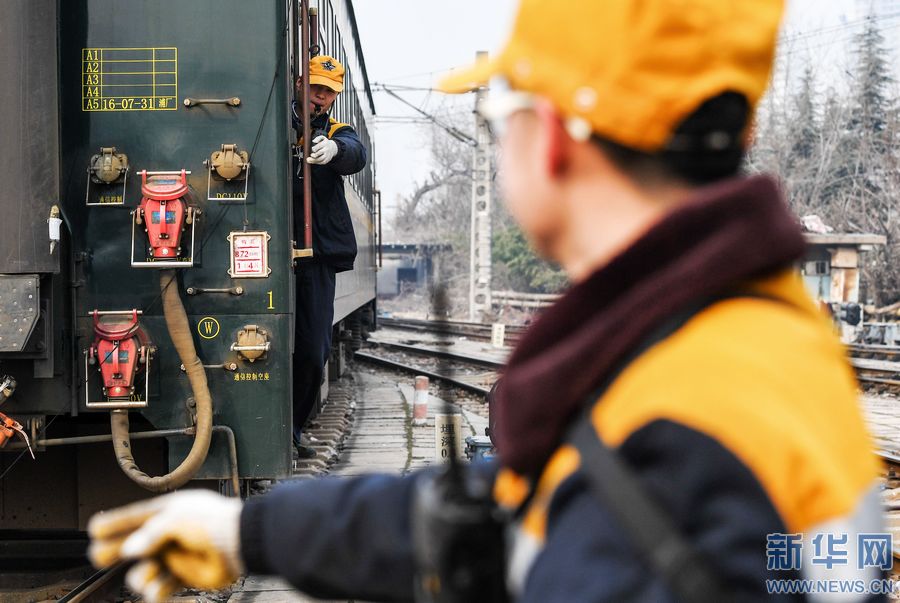 1月24日,調(diào)車員將有問題的車廂引導(dǎo)至檢修車庫。 春節(jié)臨近,鐵路迎來節(jié)前客流高峰。鐵路運(yùn)輸工作中,離不開一群為火車“穿針引線”的人——調(diào)車員,他們24小時(shí)不間斷輪班,保證列車按時(shí)出入庫,并根據(jù)車次、客流的變化,對(duì)列車車廂進(jìn)行拆分和重新編組,保障春運(yùn)期間列車安全、準(zhǔn)時(shí)運(yùn)送旅客。 鄭州火車站運(yùn)轉(zhuǎn)車間調(diào)車長程浩說:“我們的工作是把一節(jié)節(jié)車廂編組成一列火車,將其中有問題的車廂換掉,送檢、清洗,再將整列火車?yán)交疖囌景l(fā)車,形象點(diǎn)說就是為火車穿針引線!痹卩嵵莼疖囌具\(yùn)轉(zhuǎn)車間,調(diào)車小組一般由5人組成:一名調(diào)車長,四名組員。組長負(fù)責(zé)指揮調(diào)車任務(wù),組員負(fù)責(zé)檢查和監(jiān)督列車車廂之間的分解與連掛,為車輛進(jìn)行排風(fēng)、摘管等。 春運(yùn)期間,鄭州火車站運(yùn)轉(zhuǎn)車間平均每天要對(duì)70余列近1300輛車進(jìn)行調(diào)車作業(yè),比平時(shí)增加30%左右的工作量。 新華社記者 李博 攝 -
