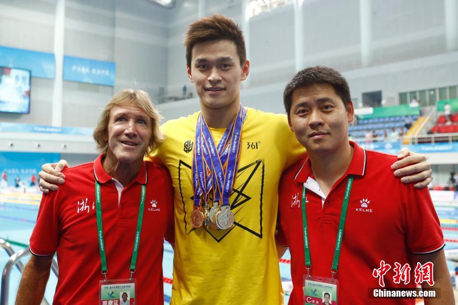9月7日,天津全運會孫楊摘得男子1500米自由泳及男子4x100米混合泳兩枚金牌,以六金一銀七枚獎牌結(jié)束全運會賽程。圖為孫楊與中方教練鄭坤良(右)及外籍教練丹尼斯(左)合影。 中新社記者 富田 攝 -
