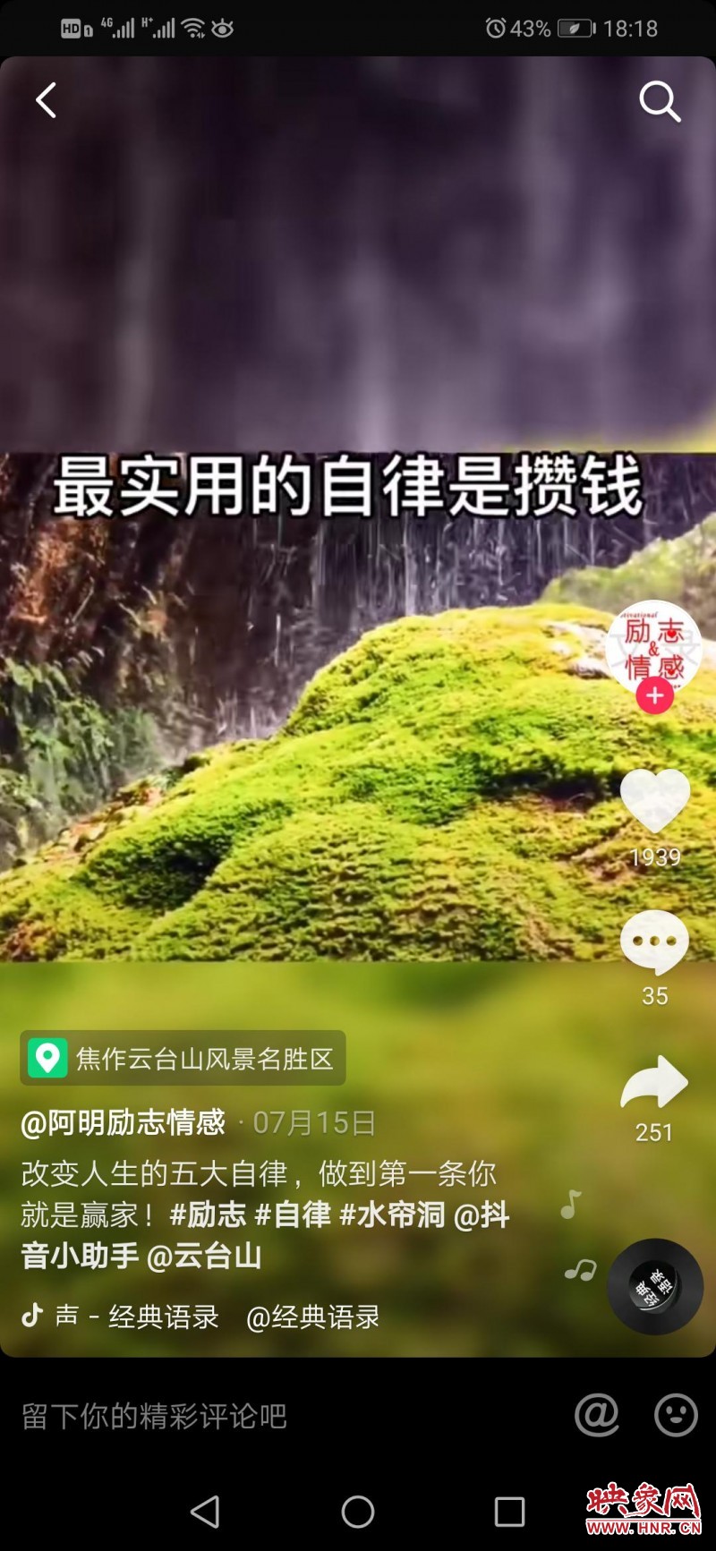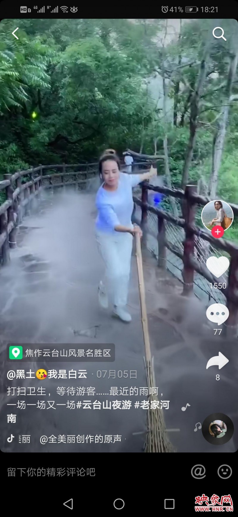 “有一次刷抖音,看到一個(gè)小姐姐在大山里配合音樂(lè)唱歌,感覺(jué)到是那么美,我就模仿這個(gè)視頻拍了一個(gè)抖音,當(dāng)時(shí)的燈光、天氣特別美,發(fā)出來(lái)以后一下就火了!惫自普f(shuō),“我工作的云臺(tái)山特別美,我就開(kāi)始把歌曲和美景結(jié)合起來(lái),推出一系列短視頻。”