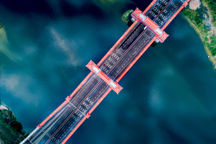 凌空俯瞰金峰大橋,紅色的廊亭、樓閣十分醒目的橫跨在九龍江西溪上。金峰大橋設(shè)計為景觀性大橋,主橋橋型采用“廊橋薌韻”方案,橋梁兩側(cè)人行道設(shè)置有長廊和古亭,橫向設(shè)置兩座人行天橋,紅磚瓦、燕尾屋融入了閩南特色建筑元素。金峰大橋是漳州九龍江上第一座具有“閩南薌韻”廊橋和古亭標(biāo)志性的大橋,成為漳州一張最靚麗的名片。