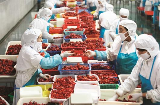 湖北日報訊 圖為:潛江小龍蝦加工現(xiàn)場