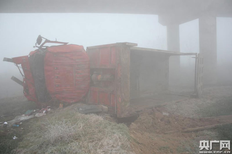 7時(shí)46分,消防官兵到達(dá)救援現(xiàn)場(chǎng)后發(fā)現(xiàn),一輛貨車側(cè)翻在高架橋路下的深溝里,駕駛室被橋底的石柱穿過(guò),被困司機(jī)生死未卜。交警已將現(xiàn)場(chǎng)封鎖,120醫(yī)務(wù)人員也在現(xiàn)場(chǎng)待命。經(jīng)現(xiàn)場(chǎng)偵查,一名中年男子被卡在駕駛室,醫(yī)務(wù)人員已經(jīng)對(duì)其進(jìn)行止血。根據(jù)現(xiàn)場(chǎng)情況,消防指揮員迅速確定救援方案,對(duì)嚴(yán)重變形的駕駛室進(jìn)行破拆。消防官兵手持液壓擴(kuò)張器變形的駕駛室進(jìn)行擴(kuò)張,擴(kuò)大了救援空間。最終,在現(xiàn)場(chǎng)救援人員的共同努力下,被困人員于7時(shí)57分成功獲救,被送上救護(hù)車前往醫(yī)院救治。由于清晨正值大霧、霜降,地面濕滑前方能見(jiàn)度不足50米,此時(shí)貨車車速較快,在看見(jiàn)橋面時(shí)已經(jīng)來(lái)不及剎車,導(dǎo)致貨車沖出橋面,釀成本次事故的發(fā)生。