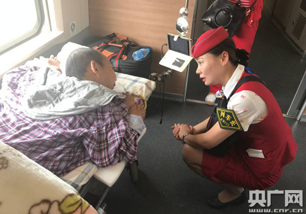 上午9點19分左右,由武漢客運段擔(dān)當(dāng)?shù)腉1034次高鐵動車組列車?吭谇G州站。此時,荊州車站送來一名重病旅客,據(jù)了解,該旅客患有強制性關(guān)節(jié)炎,全身除了眼睛能動外,四肢都無法伸直,全部彎曲在頭部的兩邊。當(dāng)班列車長李婷了情況解后,立即與其他旅客協(xié)商對座位進行調(diào)整,在她的動員下,許多旅客紛紛相讓,給重病旅客營造了一個寬松的乘車環(huán)境。