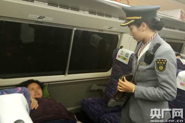 趕到車廂,為了讓空氣流通,李靜立即疏散周圍旅客避免圍觀,她讓孕婦躺在座位上,并在臀部下面鋪上軟墊,防止臍帶脫垂。并迅速與前方南京南站聯(lián)系,請求開辟綠色通道,聯(lián)系120接車。不一會兒,兩名醫(yī)生旅客也趕了過來。其中一名胡姓醫(yī)生給孕婦測了血壓,查看情況后,稱孩子胎位是橫位,羊水也流了很多,車上條件有限無法順產(chǎn),建議立即下車治療。