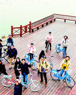 圖為市民們游玩東湖綠道,騎行共享單車是首選。(記者 梅濤 攝)