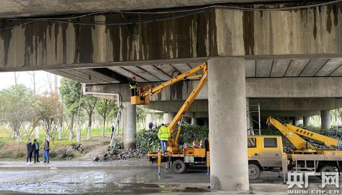 圖為:工作人員正在對破損橋面進行檢測 記者王超 攝