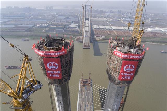 記者看到,安九鐵路鳊魚洲長(zhǎng)江大橋位于長(zhǎng)江下游河段,與福銀高速公路九江長(zhǎng)江二橋相望。爬上橋面,只見兩座H型結(jié)構(gòu)的主塔高聳,其中北主塔高252米,約80余層樓高;南主塔高242米,已于去年12月30日封頂。
