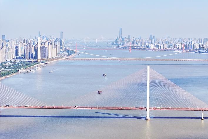11月18日,武漢天空澄澈如洗。寒潮帶來(lái)的強(qiáng)勁北風(fēng)蕩盡塵霾,長(zhǎng)江武漢段能見度陡增,從高空俯瞰,白沙洲大橋、楊泗港大橋、鸚鵡洲大橋、長(zhǎng)江大橋、長(zhǎng)江二橋、二七大橋等六座跨江橋梁次第展開,形成“一眼望六橋”的壯麗畫卷。