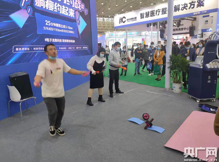 “加油跳,跳滿25分鐘,只要沒有像他們說的減脂成功,我們就能得到獎勵”在該展館的醫(yī)普茂展區(qū),一名參與“全民瘦身約戰(zhàn)”的女孩對同伴喊道;顒蝇F(xiàn)場,不少參觀者踴躍參加25分鐘減圍挑戰(zhàn),但在經(jīng)過約十分鐘的跳繩與搖健身環(huán)后均“敗下陣來”。隨后,該參展商向大家介紹了核心“黑科技”——粒子流轟脂科技,并邀請參展人群進(jìn)行體驗。