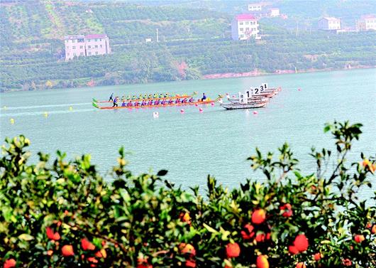 12月12日,在秭歸縣水田壩鄉(xiāng)吒溪河,參賽龍舟隊伍奮力爭先。當日,第十屆湖北省龍舟大賽吒溪河舉行,來自全省的12支龍舟隊伍展現龍舟激情,喜慶臍橙豐收。