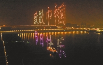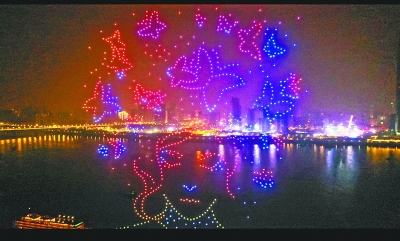 夜空中,千架無(wú)人機(jī)編隊(duì)組成“致敬巾幗、節(jié)日快樂(lè)”字樣。 記者許巍巍 攝