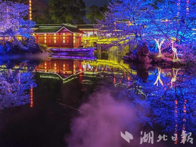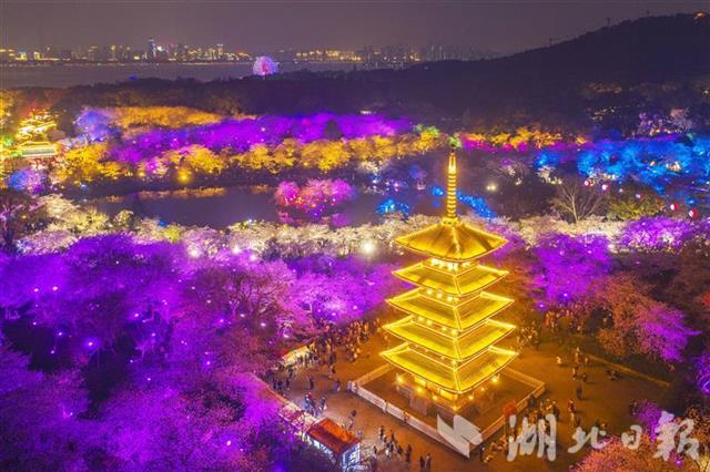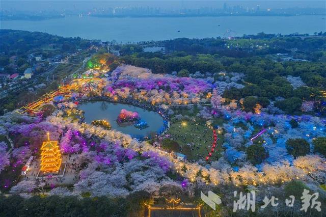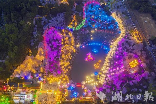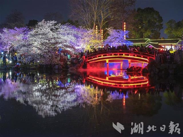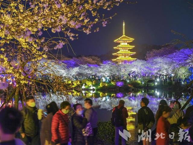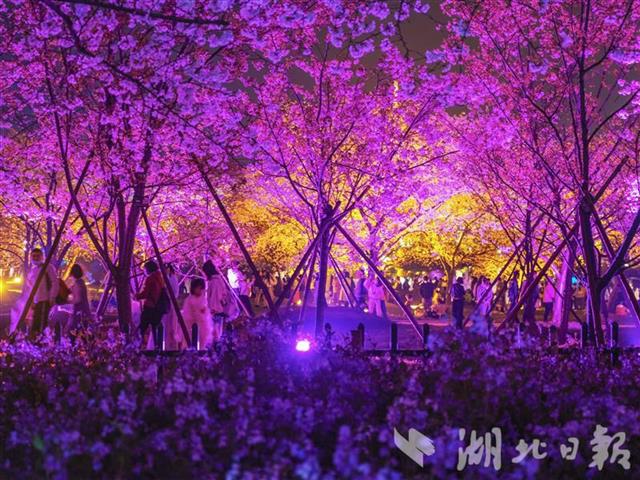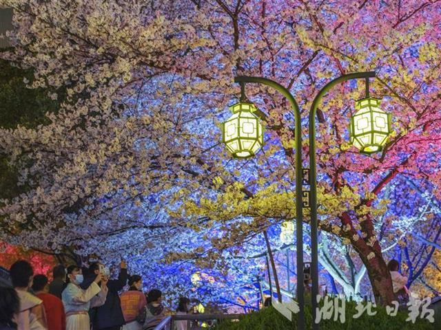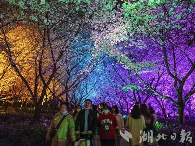3月14日,武漢東湖櫻花園內(nèi)1萬余棵櫻花樹紛紛進入盛花期。夜幕降臨,燈光璀璨,夜賞櫻花的游客摩肩接踵。13日至14日正逢周末,前來武漢東湖櫻花園觀賞櫻花的游客爆棚,兩天達8萬余人,創(chuàng)出櫻花季游客人數(shù)新高。(湖北日報全媒記者梅濤 通訊員 鄒卉 攝)