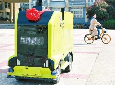 無人駕駛物流車在校園行進,吸引大學生眼球。