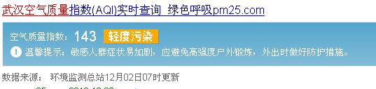 數(shù)據(jù)顯示,截至今日7時,武漢空氣質(zhì)量指數(shù)143,屬于輕度污染。
