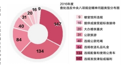 據(jù)介紹,2016年,違規(guī)發(fā)放津補貼或福利、違規(guī)配備和使用公務(wù)用車、違規(guī)收送禮品禮金等3類問題查處數(shù)量占查處問題總數(shù)的71.51%。同年,查處的隱形變異“四風(fēng)”問題占全年查處問題總數(shù)的11%,較2015年增長1.5個百分點,主要表現(xiàn)為變相公款旅游、私車公養(yǎng)、擴(kuò)大范圍“搭車”發(fā)放津補貼等。