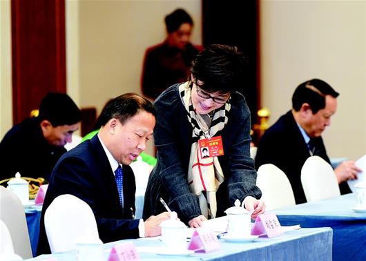 湖北日?qǐng)?bào)訊 圖為7日,劉雪榮代表(左)和楊俊代表(右)在長江法的議案上進(jìn)行聯(lián)名。 (全媒體記者 張朋 攝)