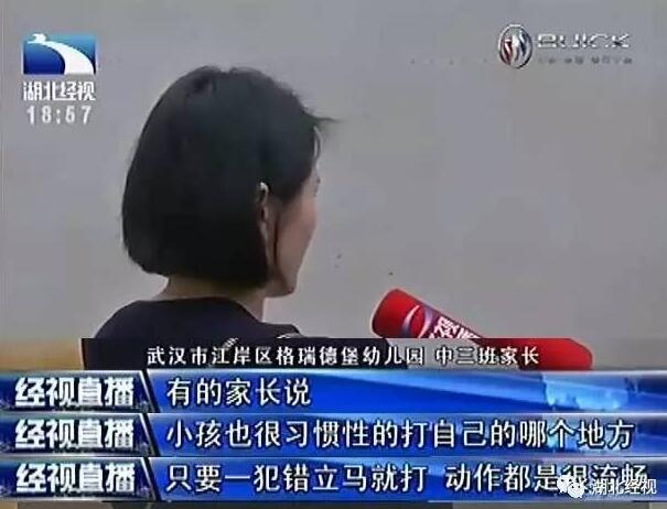 武漢市格瑞德堡幼兒園中三班家長:我?guī)『⒌饺ヅ笥鸭胰ネ,朋友就問我小孩你說你這調(diào)皮老師打不打你嗎?小孩說老師打。他說老師經(jīng)常要他們自己掌嘴。