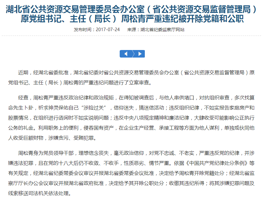 湖北省公共資源交易管理委員會辦公室(省公共資源交易監(jiān)督管理局)原黨組書記、主任(局長) 周松青嚴(yán)重違紀(jì)被開除黨籍和公職