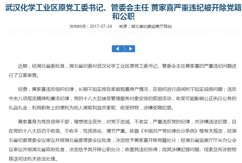 據(jù)湖北省紀(jì)委監(jiān)察廳網(wǎng)站7月24日通報: