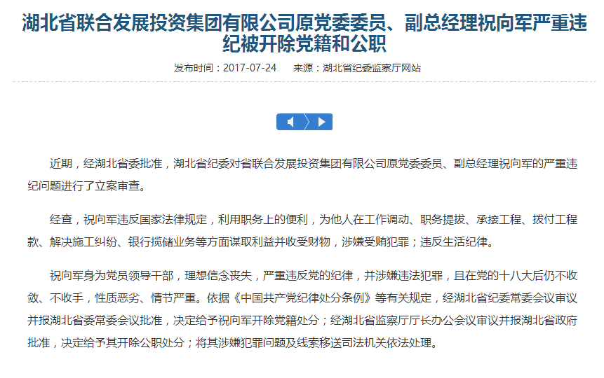 湖北省聯(lián)合發(fā)展投資集團有限公司原黨委委員、副總經(jīng)理祝向軍嚴(yán)重違紀(jì)被開除黨籍和公職