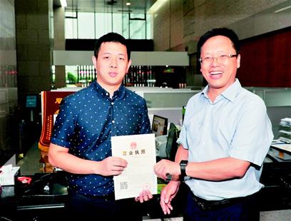 圖為:企業(yè)負責人(左)從武漢市工商局局長劉濤手中領到首張“28證合一”工商執(zhí)照