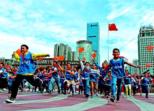 圖為:10月4日,武漢黃鶴樓景區(qū),3名外地小游客揮舞著手中的國旗。(湖北日報(bào)全媒記者 魏錸 攝)