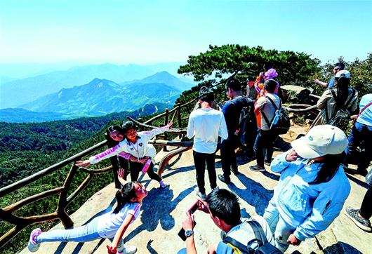 圖為:10月3日,在羅田縣薄刀峰山頂,游客觀賞美麗的大別山景色。(湖北日報(bào)全媒記者 張朋 通訊員 劉世民 攝)