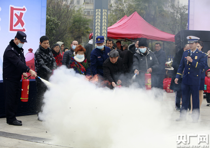 圖為:12月10日,在湖北省荊州市監(jiān)利市玉沙廣場(chǎng),社區(qū)網(wǎng)格員和市民一同體驗(yàn)利用滅火器撲救油盆火災(zāi)。央廣網(wǎng)發(fā) 通訊員王方 攝