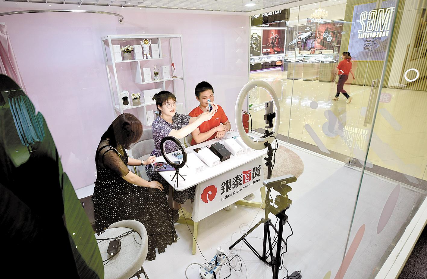 6月17日,武漢銀泰創(chuàng)意城共享直播間里,主播為華為手機(jī)、手表等產(chǎn)品進(jìn)行帶貨直播!618電商大促”之際,線下商家也紛紛參與,共促武漢商業(yè)復(fù)蘇。 (湖北日?qǐng)?bào)全媒記者 李溪 通訊員 唐雅倩 攝)