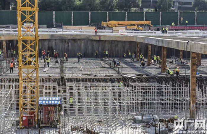 在新建科研樓基坑西側(cè),2臺(tái)58米的混凝土泵車正在進(jìn)行地下室底板混凝土澆筑;南面,鋼筋班的76名工人正在綁扎地下室主體結(jié)構(gòu)鋼筋;北面,工人們?cè)趯?duì)抗浮錨桿進(jìn)行最后的安裝和校正。在新建智慧立體停車庫(kù)施工現(xiàn)場(chǎng),7臺(tái)吊車也正在有序的進(jìn)行鋼結(jié)構(gòu)的轉(zhuǎn)運(yùn)和吊裝。