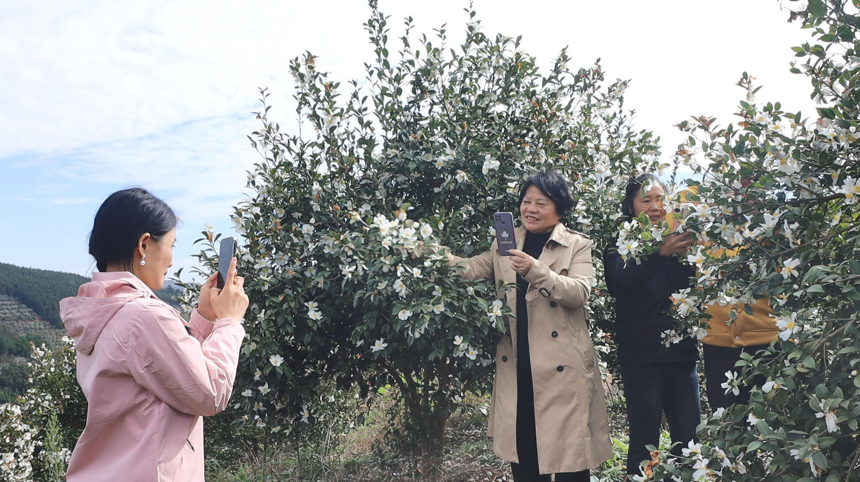“漫山遍野的油茶花清新素雅,空氣中彌漫著甜甜的清香,特別治愈!眮碜钥h城的游客黃百合興奮地說,“今天和幾個姐姐一起來看油茶花,真的太驚喜了!我們拍了很多美照,要把這份美好分享給更多朋友!