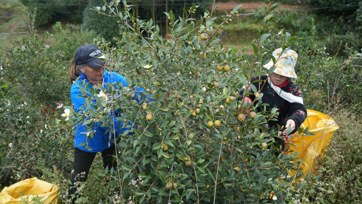 農(nóng)戶們搶抓時(shí)節(jié)采收油茶,繪就一幅生動(dòng)的豐收?qǐng)D景。