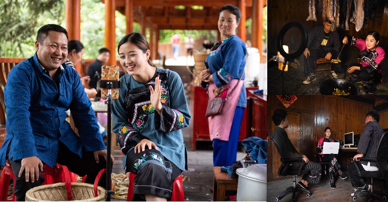 拼版照片:左圖為十八洞村扶貧隊長麻輝煌(左)與返鄉(xiāng)大學(xué)生施林嬌(中)在湖南湘西十八洞村,一起直播推銷土特產(chǎn)(5月15日攝);右上為施林嬌(右)在直播中向觀眾展示炒好的臘肉(4月23日攝);右下為施林嬌(中)在工作室內(nèi)和施康(左)、施志春(右)一起商討直播內(nèi)容(4月23日攝)。